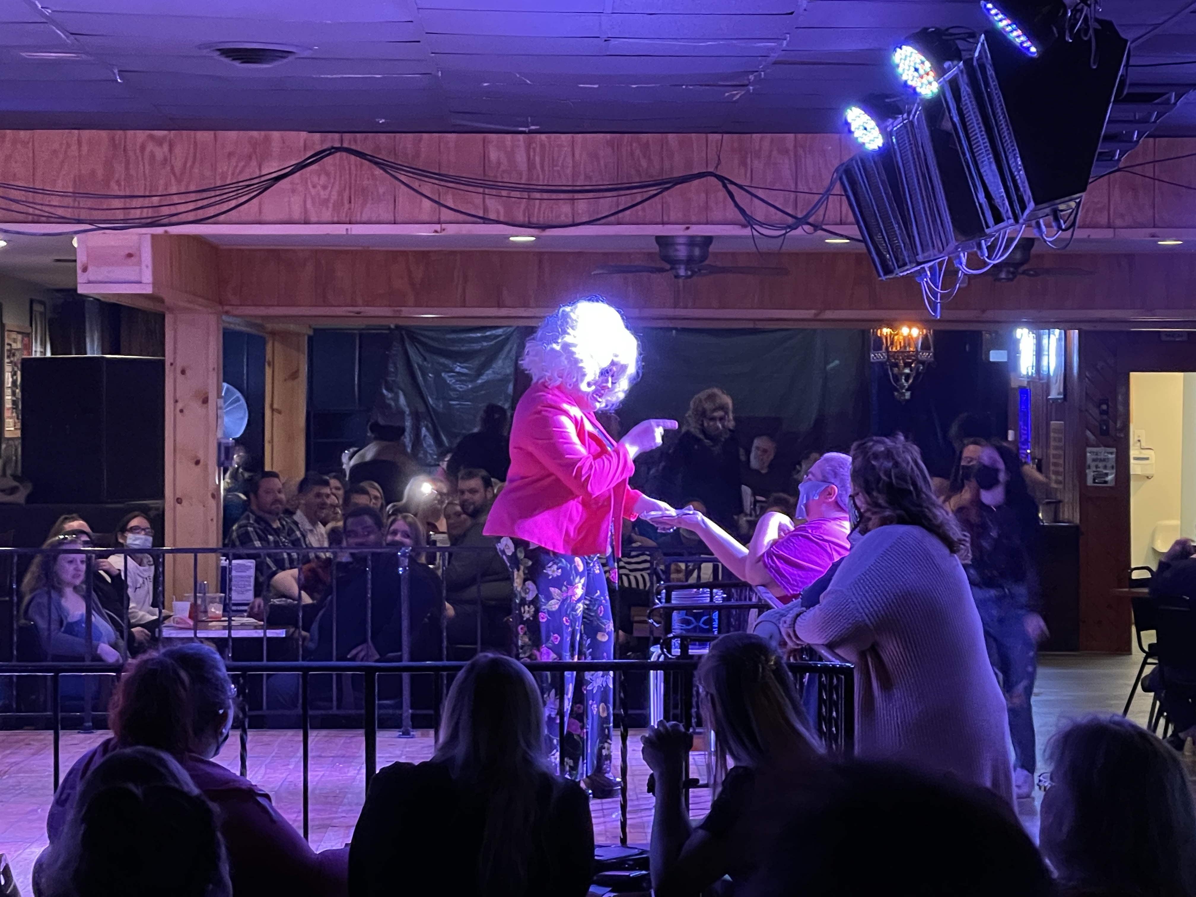 The crowd is a mix of bachelorette and ladies as far as the eye can see. It’s the kind of crowd that loves to support drag while at the same time wanting to be the center of attention.