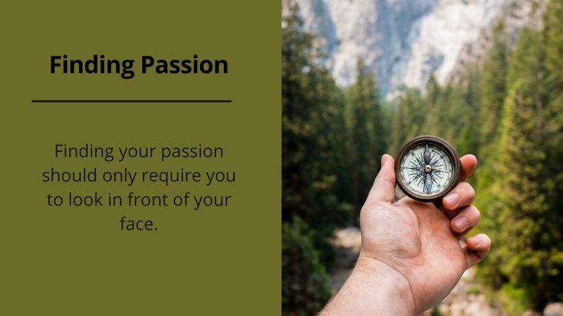 Finding your passion should only require you to look in front of your face. If you are spending a lot of time and effort trying to “find” what you are passionate about then you’re probably not that passionate about things. The good news is, you don’t need to “find” your passion.