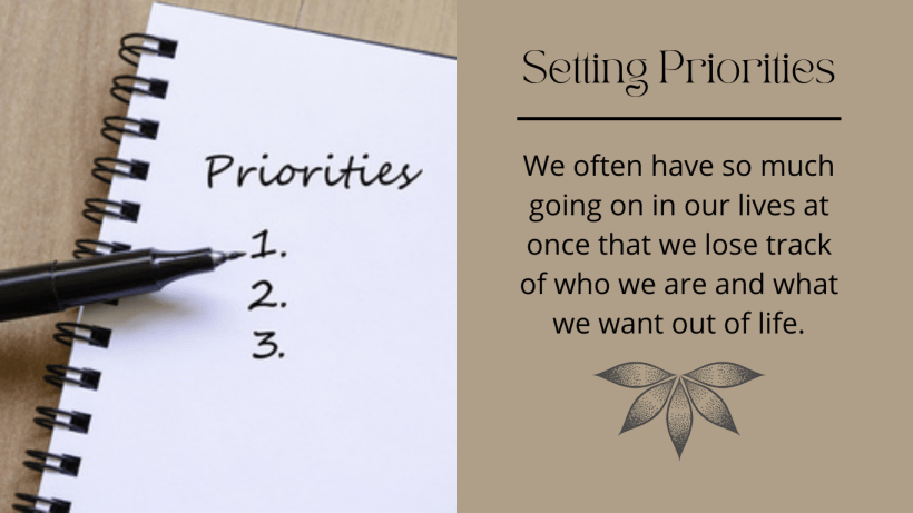 Setting priorities is important because we often have so much going on in our lives at once that we lose track of who we are and what we want out of life. We end up putting out one fire only to be confronted with yet another that takes its place. With so many things on our plate at once, it’s easy to neglect ourselves, friends and family.