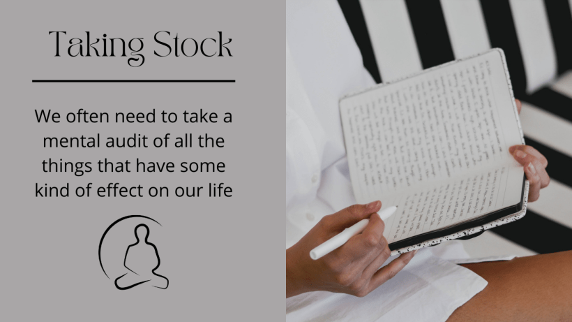 Taking stock of your life allows you to think carefully about the things in your life so that you can decide what to do next. It allows you to make considered and deliberate decisions, instead of just reacting to a situation. We often need to take a mental audit of all the things that have some kind of effect on our life so that we can see where our mental energy is being spent and if it is worth it.