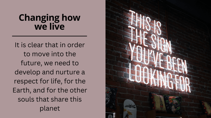 No longer are we focused solely on ourselves and our own gratification. It is clear that in order to move into the future on this planet, we need to develop and nurture a respect for life, for the Earth, and for the other souls that share this planet with us. For each of us, this involves changes in the ways we live our lives, and in the ways we relate to others.