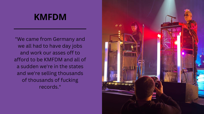 KMFDM came to America from the urgings of the Wax Trax! Founders, Jim Nash and Dannie Flesher. They signed KMFDM to release their album Naive. That album featured a remixed track Naive that landed at #21 on Billboard’s Dance/Club chart in March 1991. At the time Sascha moved to Chicago and was quoted saying “We came from Germany and we all had to have day jobs and work our asses off to afford to be KMFDM and all of a sudden we’re in the states and we’re selling thousands of thousands of fucking records.” To say the least, American helped them reach the acclaim they now have. A huge thanks goes out to Nash and Flesher for urging them to come to America and be a part of our music scene.