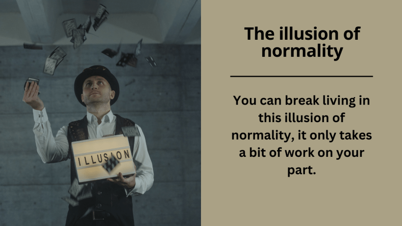 You can break living in this illusion of normality, it only takes a bit of work on your part. We have to learn to reset our thoughts. Throw out the ideal that going against the grain or being different is bad. When I make that statement, my mind races back to a 1980s commercial for Apple computers where a woman bursts into a room that looks ripped from the movie 1984.