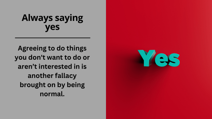This one is hard, I will admit that. Too many times we are asked to do things that we don’t want to do. Our friends show up with some crazy idea they have and want you to be a part of it and you reluctantly say yes. Agreeing to do things you don’t want to do or aren’t interested in is another fallacy brought on by being normal. We are taught that if you are a normal person with healthy relationships, you agree to what is being asked as a way to show you care for that person.