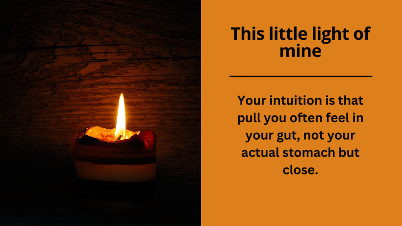 Your intuition is not logical, it is not a set of considered steps that can be shared or explained. BUt it feels more natural and relatable than the measured feelings we use in making decisions. Where choice can often bog us down and add confusion, the intuition is quick and direct. It is based on lived experience and knowledge.