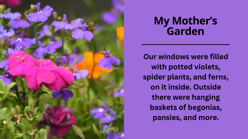 Our windows were filled with potted violets, spider plants, and ferns, on it inside. Outside there were hanging baskets of begonias, pansies, and more. The yard was filled with lilac bushes and concrete planters of petunias. Around the house you could find small patches of gladiolas, irises, and tulips. And of course, we had our garden down in the hollow.