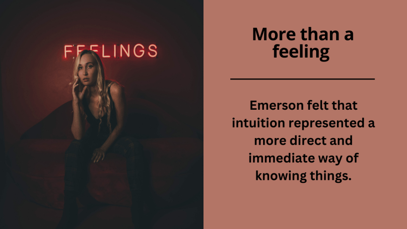 What did Emerson mean in this line? Emerson felt that intuition represented a more direct and immediate way of knowing things. To know something so deeply without having any prior knowledge of it before. It is not the same as learned thought. Most of us can happen upon our intuition without any real training. It pops up when we need it to save us from a bad choice or perhaps to give us a moment of beauty we might have otherwise missed.