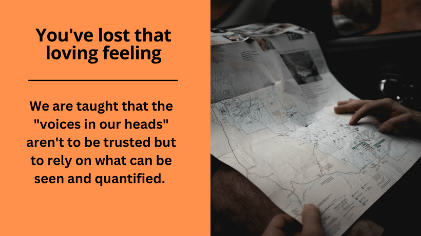 Teachers, doctors, and bosses equate listening to that inner voice to daydreaming and a waste of time. So, we encourage children to put them aside for reason and conformity. From there we find other ways of ignoring our inner voice.