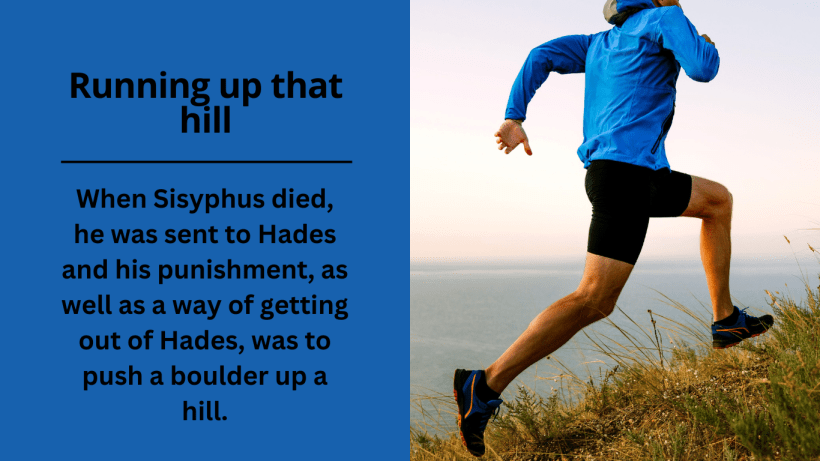 In Greek mythology, the Corinth king, Sisyphus was known as a trickster. In fact, he cheated death on several occasions. Seeing this, Zeus – king of the gods, decided on a punishment.When Sisyphus died, he was sent to Hades and his punishment, as well as a way of getting out of Hades, was to push a boulder up a hill. If he reached the top, he was free. The problem is that Sisyphus would never reach the top, as the boulder would be pulled back down, everytime. But Sisyphus never gave up.