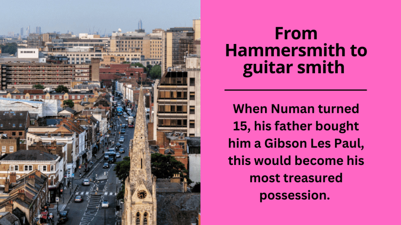 He started playing music at a young age, learning to play the piano and guitar. When Numan turned 15, his father bought him a Gibson Les Paul, this would become his most treasured possession. From here his music career started to rise. He played in various bands around the area, anywhere he could learn and play. He was also noted for flipping through Melody Maker looking for any bands he could sit in on. He landed in a band called Mean Street and the Lasers where he met Paul Gardnier. As their friendship grew, the Mean Street Lasers soon became the Tubeway Army/ They added his uncle Jess Lidyard to play drums and Gardiner on bass. They were quickly signed to the label Beggars Banquet Records and in 1978 released their first record. It would be their second album, Replicas, that would start their rise to success.