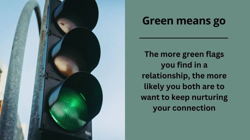 The more green flags you find in a relationship, the more likely you both are to want to keep nurturing your connection. Just remember that the green flags in relationships can be different depending on the emotional needs of you both at that given time. What is good in this relationship may be completely different in another. This is why it is so important to keep checking in with yourself about what your needs are. It can also help you identify your own good or bad relationship habits.