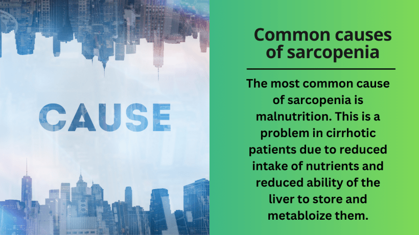 One of the most common causes of sarcopenia is malnutrition. Malnutrition is a common problem in cirrhotic patients due to the reduced intake of nutrients and the reduced ability of the liver to store and metabolize nutrients. This can lead to a deficiency in essential nutrients such as protein, vitamins, and minerals, which are essential for muscle growth and maintenance.