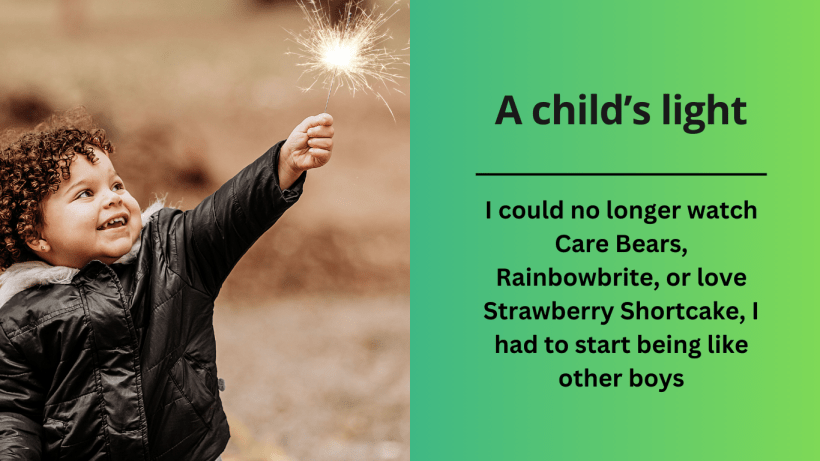 As a child, I didn’t know the far reaching implications those judgments and thoughts would have on me. Then with my father trying to impress upon me what proper boys were supposed to like and how to become a man, the very things that brought me joy were called into question. I had to learn to fit in or as he said it, be like real boys. Dolls were traded for cars and balls, my magic bag was tossed out and a toy box was to be used. And my playtime was cut down so that I could learn how to be a man by learning to cut wood, mow the yard, and such.