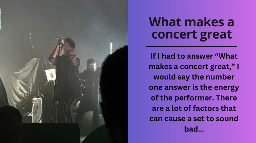 If I had to answer “What makes a concert great,” I would say the number one answer is the energy of the performer. Many would say they need to sound amazing or put on a good show. There are a lot of factors that can cause a set to sound bad and most do not fall to the responsibility of the performer. Energy is solely their own.