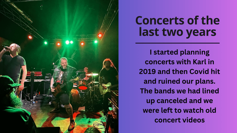 I started planning concerts with Karl in 2019 and then Covid hit and ruined our plans. The bands we had lined up canceled and we were left to watch old concert videos on his couch. The stories he had about the bands he had seen were enthralling. I wanted experiences like that. So we continued to plan.