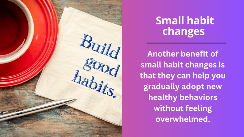 Another benefit of small habit changes is that they can help you gradually adopt new healthy behaviors without feeling overwhelmed. For example, if you want to start exercising regularly, start by incorporating a short walk into your daily routine and gradually increase the duration and intensity of your workouts.
