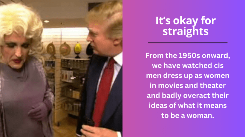 From the 1950s onward, we have watched cis men dress up as women in movies and theater and badly overact their ideas of what it means to be a woman. They present them in less than favorable fashion, usually as a bit dumb, oversexualised, and a big victim. We are all supposed to just sit here and accept that because they meant it out of jest. These very actions devalue and demoralize the very ideas of femininity.