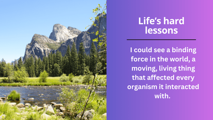 I could see a binding force in the world, a moving, living thing that affected every organism it interacted with. It gave them air to breathe, food to eat, and a bed to comfort them in death. It was both cruel and comforting. It showed me that events happen and we are left to try to figure out a lesson from it, not that it was trying to teach us. How we choose to handle those situations makes us stronger and teaches us how we can control them. With that, there was no need for dogma. Furthermore, it was not a belief created by a flawed species to try to make sense of things we don’t want to think about. More importantly it taught me that I am in full control of how a situation can affect me.