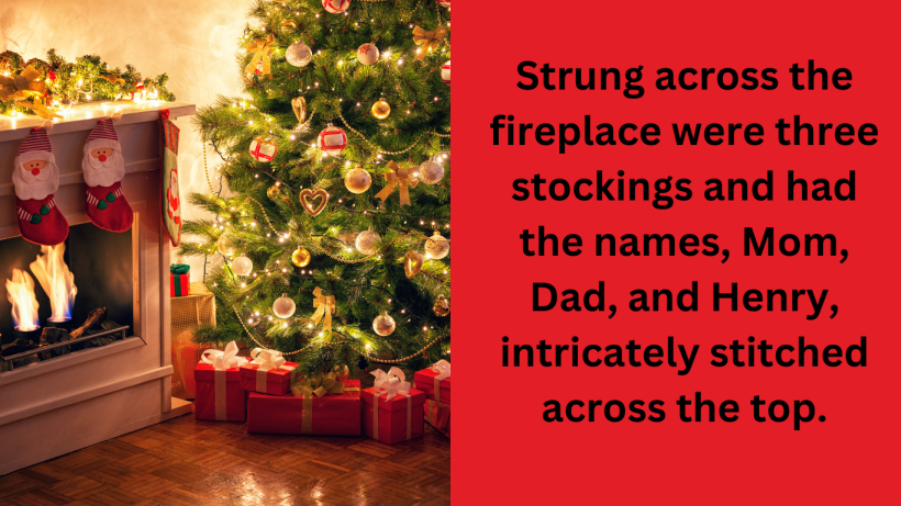 As the figure took upon the tree topper, a warmth filled his eyes and a soft smiled stretched his mouth. Strung across the fireplace were three stockings and had the names, Mom, Dad, and Henry, intricately stitched across the top. To the left of the fireplace sat an old dark brown leather chair. This used to be the prized seat in the house, it was a place that Henry loved to be. He would sit on his father’s lap as he listened to the stories from the many books on the shelves behind the chair. It had been his escape from the world, for the briefest of moments. Beside the chair stood the small table that had a plate of cookies, a glass of milk, and the note from little Henry. The figure picked up the note and read the words that Henry had scrawled on it. As he got to the last line, the figures eyes narrowed as a grin played across his face. As he smiled, he turned back to the tree and, unbeknownst to the figure, his sack bumped the table and caused it to slide across the floor.
