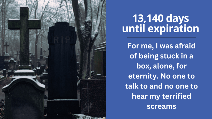 Most kids fear death, to some degree, and it’s only natural. For me, I was afraid of being stuck in a box, alone, for eternity. No one to talk to and no one to hear my terrified screams of being alone in the dark. It was around the year 1984 that I started having this dream that I would die in my adulthood. At the time, I don’t think I had a concept of the age other than I wouldn’t get the chance to be old and gray. It terrified me.