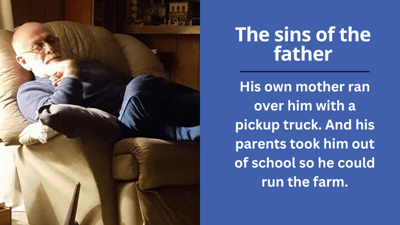 My father had a rough childhood. At a young age, he was forced to tend a 180 acre farm while his brothers and sisters got to enjoy their childhood. He had a mother and father that would beat him for “stepping out of line.” His own mother ran over him with a pickup truck. And his parents took him out of school so he could run the farm. Thanks to being the oldest child, he didn’t have to serve in the military as he was the provider to the farm, instead his brothers went. He did not grow up in a loving household.