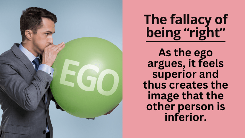 As the ego argues, it feels superior and thus creates the image that the other person is inferior. This is a fear based response from a fixed or closed mindset. The problem is that the message it sends to the world is that we are actually really insecure. So then, why do we argue th point? The truth is that we are attached to our opinions and being forced to change that understanding is uncomfortable. And we dont want to feel uncomfortable.
