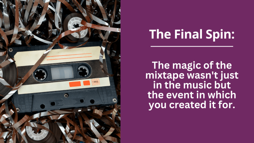 So there you have it, folks! The magic of the mixtape wasn’t just in the music but the event in which you created it for. If the mix is just right, it added a special sauce to those memories. If it was slightly off, then you would have been remembered for messing up the soundtrack to an important life moment. The outcome was in your hands, so to speak. It took practice to craft what would be the soundtrack to a memorable event and that could only be achieved by repetition.