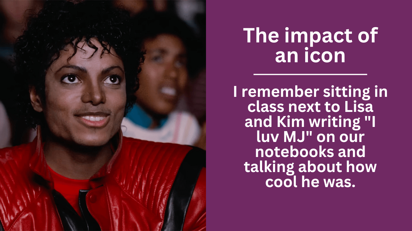 MIchael Jackson was the first musician that I fell in love with. From his music, his signature look, and everything about him fascinated me. I didnt know that what I was experiencing was a crush, at the time. I remember sitting in class next to Lisa and Kim writing “I luv MJ” on our notebooks and talking about how cool he was. They never seemed weirded out by my fascination for who would become the King of Pop, all we knew is we shared a common interest.