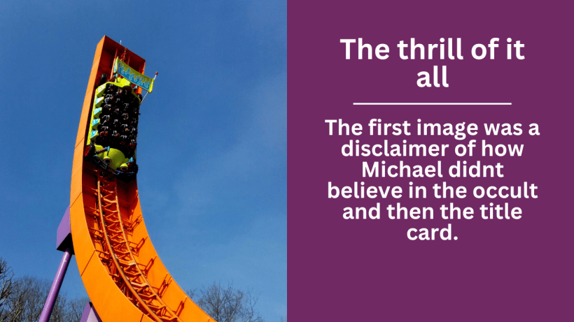 The announcement came of the start of the new video and everyone gathered excitedly started talking about how excited they were to see the new video. As the opening started everyone in the immediate vicinity went quiet. The first image was a disclaimer of how Michael didnt believe in the occult and then the title card. What happened next was epic in a way that I had no comprehension of.