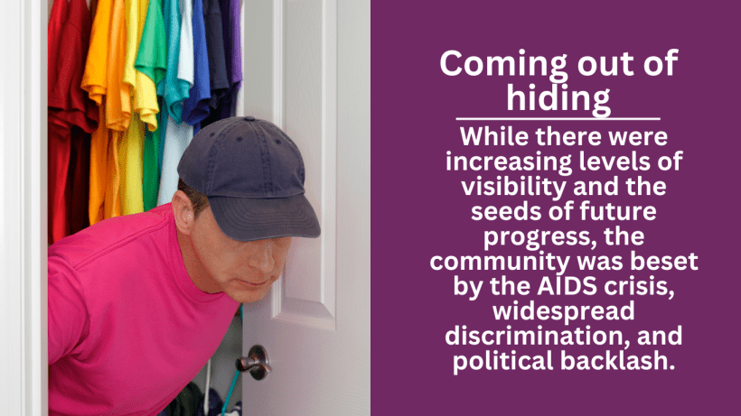 • Homophobia: Homophobia was pervasive in the 1980s. The LGBTQ Community faced discrimination in employment, housing, healthcare, and social settings. It was not uncommon for people to be ostracized by their families, lose their jobs, or face violence for coming out.