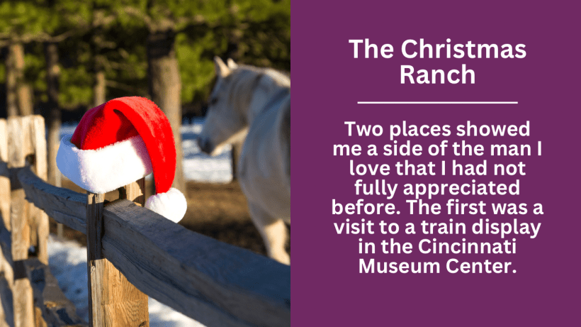 Located in Morrow, Ohio is a small hilltop that has been transformed into a Christmas wonderland, it’s called The Christmas Ranch. This was a destination I had picked for Karl’s fortieth birthday. I wanted to take him to a place that was completely Christmas. A place he would enjoy and find inspiration for his multitude of Christmas trees. There were many places we went, while in Morrow and many of them left me feeling a bit let down in my plans. Two places showed me a side of the man I love that I had not fully appreciated before. The first was a visit to a train display in the Cincinnati Museum Center. He had very fond memories of his childhood and a train display they used to put out. His eyes lit up and I watched as the dark veil of worry seemed to lift off him and be replaced with child wonderment that is reserved for our best memories. I knew it was a win.