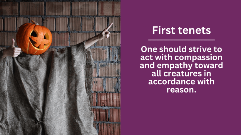 Remember, that the tenets are written in an ascending order and builds on what is before it. Tenet seven is the culmination of those tenets and practices. It tells you how to interpret them, ranking them in importance. But, I am putting the cart before the horse here. Let’s look at the first and important Tenet. This is similar to Do Unto Others As You Would Have Done Unto You, but with an added coverage for all things living.