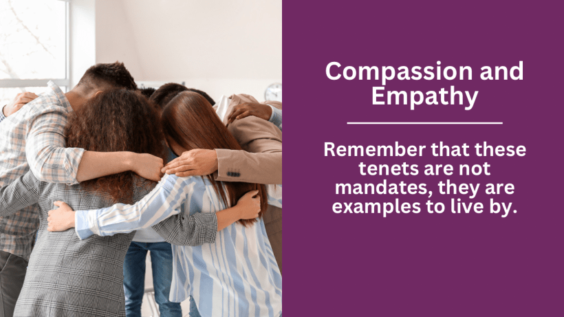 Remember that these tenets are not mandates, they are examples to live by. What would be thought of as a good way to live and interact with others. We all could use a bit more compassion and empathy, especially towards ourselves. This allows us to see the world in a more open minded fashion and a realization that our mindset only shapes our perception of the world, not the actual world. Altering how we interact with it and its inhabitants allows us to better work together and see ourselves in a better light.