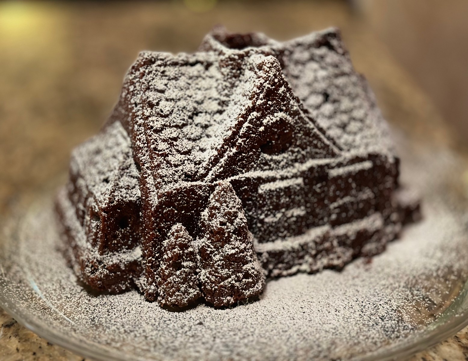We often used a mold to bake this cake in, the mold is in the shape of a house in winter and when lightly dusted with powdered sugar, takes on the look of a cottage covered in snow. It is beautiful. (pic below)