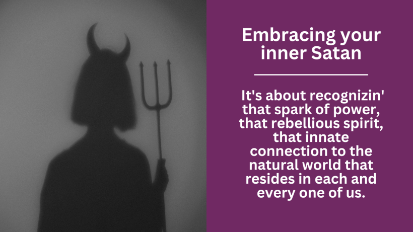 See, Satanic witchcraft, for me, ain’t about some outside force. It’s about lookin’ inward, findin’ that spark of rebellion, that fire in your belly, and usin’ it to manifest what you want in life. It’s about knowin’ that you’re the master of your own destiny, and usin’ a little bit of magic to nudge things in the right direction.