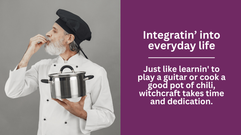 Remember, practice makes progress. Just like learnin’ to play a guitar or cook a good pot of chili, witchcraft takes time and dedication. Don’t get discouraged if you don’t see results right away. Keep at it, keep learnin’, and keep trustin’ in your own power.