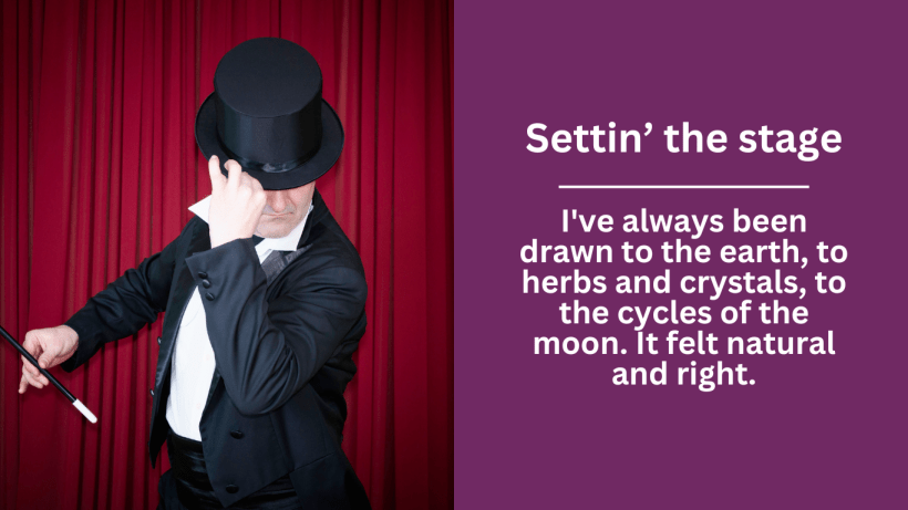 What does any young southern person do when they are curious and obstinate, I started exploring different philosophies, different ways of looking at the world. I first stumbled upon witchcraft. I’ve always been drawn to the earth, to herbs and crystals, to the cycles of the moon. It felt natural and right. I bought every book I could find and started collectin’ crystals and herbs. It was exciting and felt… right.