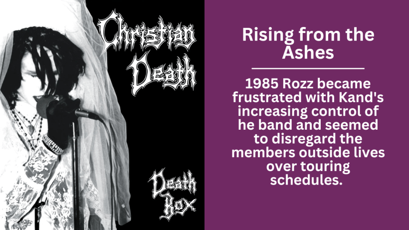 While Christian Death saw its first setback in 1983, Rozz was unswayed in his vision. He joined the group Pompeii 99 with its members; guitarist/vocalist Valor Kand and drummer Glass Prkinson. Rozz urged the band to bring inKand’s partner, Gitane Demone, as their keyboardist. This would be the first change that Rozz brought to this band. Shorty after the addition of Demone, French record label L’Invitation au Suicide approached Rozz to record another album and do a European tour. The band reached out to Constance Regrave to join them as bassist and the band became the resurrected Christian Death. This lineup would create their next album, Catastrophe Ballet in 1984. This album was the critical move away from their punk roots to their sound that would go on to be the influence for the deathrock scene. Shortly after its release, the band lost another member, bassist Cinstance Smith. This led for Dave Roberts, Sex Gang Children, taking up bass. The band returned to America in 1984 and recorded Ashes in 1985. Roughly, halfway through 1985 Rozz became frustrated with Kand’s increasing control of he band and seemed to disregard the members outside lives over touring schedules. He had tried to talk Gitane Demone into leaving as well, however Kand and Demone had a child together which prompted her to stay.