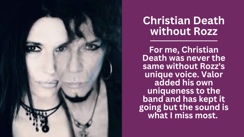 For me, Christian Death was never the same without Rozz’s unique voice. Valor added his own uniqueness to the band and has kept it going but the sound is what I miss most. Though Valor has continued putting out music and staying true, as possible, to the band’s original concepts. They created the genre of American goth rock, was the influencer to Death Rock and born of the protesting roots of the punk scene, Christian Death has stood against organized religions and conventional morality since its inception. Their shows were dripping with theatrics that took their cues from the likes of David Bowie and pioneer industrial artist Throbbing Gristle. Their music fit the early 80s goth culture perfectly, with their slow, doom laden, guitars and a heaving leaning into macabre soundscapes.It became the avenue for American goth and punk kids to express their rebellion and feel seen.