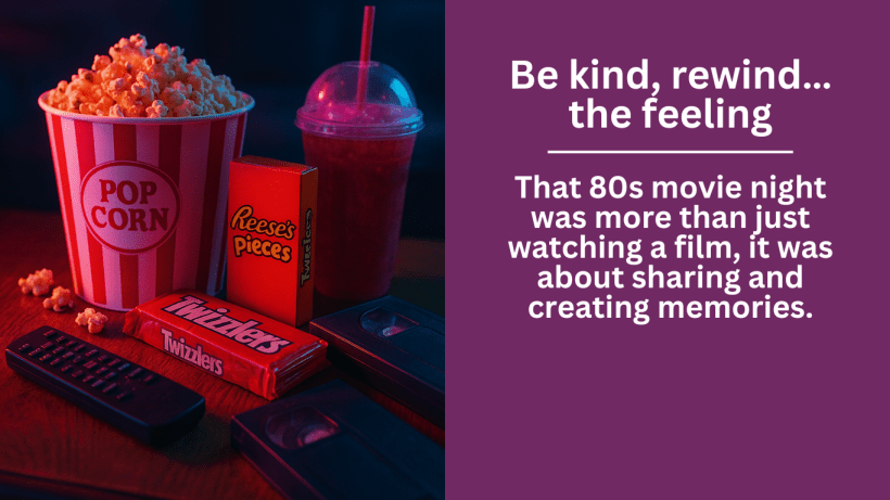 That 80s movie night was more than just watching a film, it was about sharing and creating memories. It was about falling in love with a story, the way we were supposed to. It was personal and required an investment. It created memories, whether from the feeling of standing around a stove as you shook that package of Jiffy Pop popcorn, watching it pop until you had that foil ball full of popcorn or from constantly trying to dial in that tracking to the perfect spot, those memories stuck with you, adding to the feelings the movie left you with. It was… amazing.