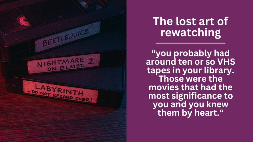 What about you, what VHS movie night memories do you have? Let me know in the comments below. And what better way to relieve them than creating that feeling again. The next time you get together to watch a movie, recreate that ritual, choose the movie together, make the popcorn, dont press the skip buttons, and just enjoy the moment. Then, let me know what you watch in the comments below.