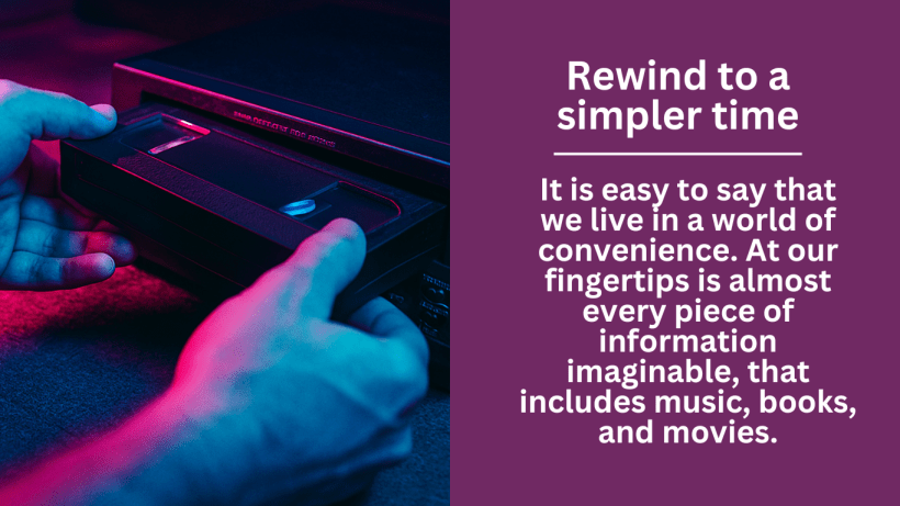 The scene slowly comes into focus, a town appears. Not just any town, your hometown. Slowly, at first, the vantage point shifts and now we are zooming in, someone comes into view. Where are they going, what are they doing, is it important or just a casual walk? Who knows but the camera is still coming in revealing more about the character in front of us. Suddenly, you realize its you and it’s a Friday night. You are on your way to the local movie store, on a mission to find the perfect movie or movies for a friday movie marathon. Your hand wraps around the handle of the door and you slowly pull it towards you. Your senses are awash in the smells, sounds, and sights of the movie store and it leaves you reeling from the excitement and possibilities. You head to the New Release rack first, to see if the movie you have been waiting on is available… amazingly, there it is – just one left. This must be divine providence. You get to the counter with your movies in hand, the clerk welcomes you and asks for your membership card. You grab your wallet, pulling the rental card out, you had it over. Your entire mind reeling with the excitement of getting to see this new movie. You grab some snacks, pay for your selection and you are out the door, on your way home to watch them with your friends, family, or just yourself.