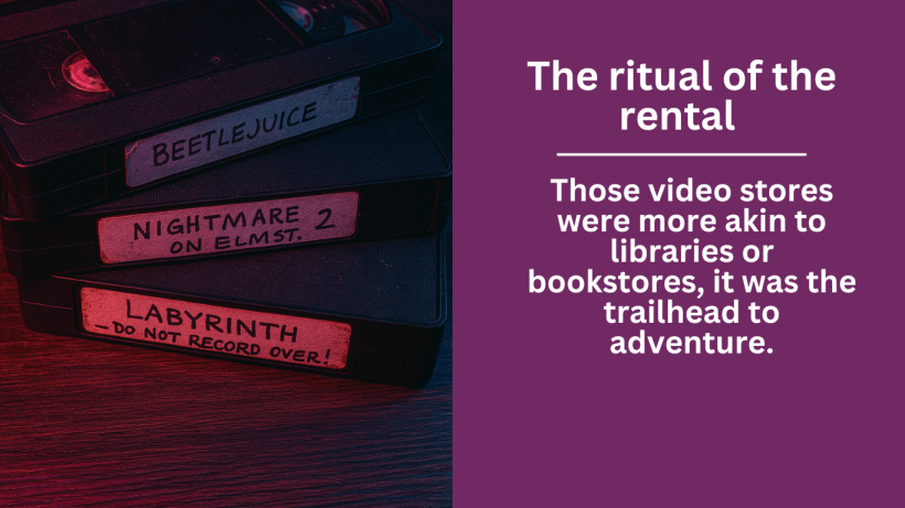 As I look back, there was comfort in VHS. I mentioned earlier the ritual of it all, it really was like a spiritual ritual. Watching a movie was an event. You picked the perfect spot to watch it and made it as comfortable as needed. There was forethought in the snacks you were going to eat and was part of the atmosphere building of it all. You turned down the lights, drew the shades, and surrendered your senses to the magic that was about to wash over them. You wanted the perfect environment with minimal distractions to fully emerge yourself. This was all without the massive surround sounds we have now or wall sized televisions. It was personal, intimate, it was the way home viewing was intended.