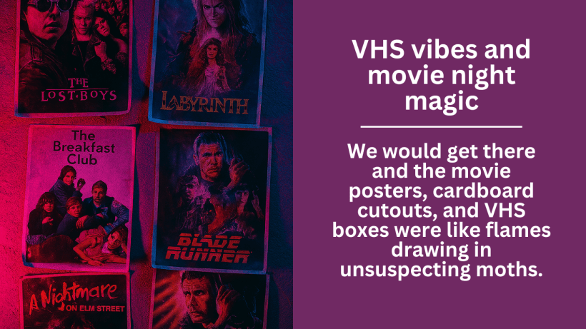 Ahh movie nights, the memories that take me back. I often tried to decide what I wanted to watch before we ever got there. I would listen to what my friends were watching and make mental checklists. All of this would be for naught. We would get there and the movie posters, cardboard cutouts, and VHS boxes were like flames drawing in unsuspecting moths. Every thought I had, gone from my head, awash in the vivid scenes laid out on the shelves before us. But that was part of the adventure.