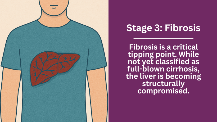Fibrosis is when scar tissue begins to replace healthy liver tissue, affecting blood flow and filtering processes. At this point, liver function starts to suffer—but the organ still has some ability to repair itself.