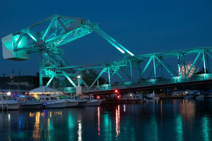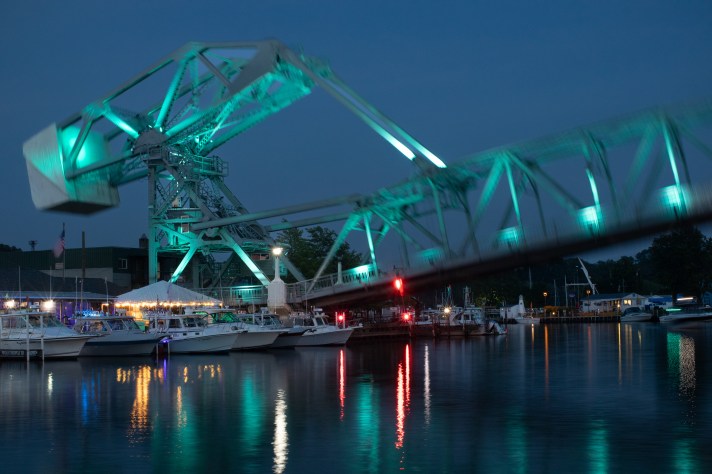 As blue hour crept in, the amazing sights took over. Boats would go out of the harbor area or return from the lake. It was peaceful and serene.I took a few shots with the SX-70, while I still had enough light and even tried some more artful styles while playing with lights. Then I set up the tripod and my Canon. As the sky became darker shades of blue, we started seeing fireworks in the coves behind the bridge and I thought it would be awesome to get some as the bridge is raising or lowering. Much to my surprise, most of the fireworks explosions were out of the way of thr bridge or were covered once it was up.But I still hoped for a few shots.