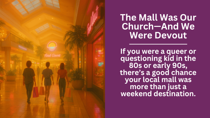 If you were a queer or questioning kid in the 80s or early 90s, there’s a good chance your local mall was more than just a weekend destination. It was sanctuary. The mall was where we first flirted with identity, where the fluorescent lighting and food court smells masked a sacred coming-of-age ritual. Before we had Pride parades or queer TikTok influencers, we had Claire’s. We had the kiosk girl who let us try the glittery nail polish even if we “weren’t supposed to.” And we had the quiet thrill of passing by Spencer’s Gifts and wondering what was in that section in the back.