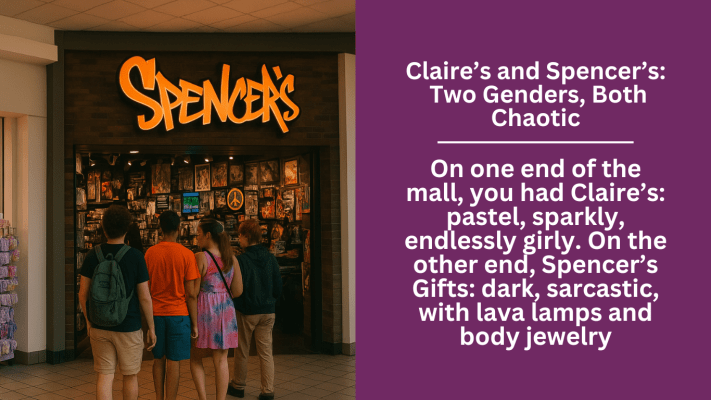 On one end of the mall, you had Claire’s: pastel, sparkly, endlessly girly. On the other end, Spencer’s Gifts: dark, sarcastic, with lava lamps and body jewelry you weren’t quite brave enough to buy. If you could bounce between both stores in a single visit, congratulations—you were probably already experimenting with gender long before you had the words for it.