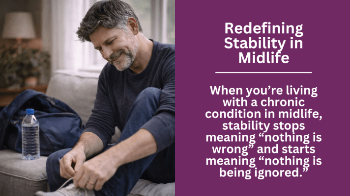 When you’re living with a chronic condition in midlife, stability stops meaning “nothing is wrong” and starts meaning “nothing is being ignored.” Chronic illness in midlife doesn’t ask for perfection or constant improvement, it asks for attention, flexibility, and honesty. Stability isn’t the absence of symptoms or the return to some imagined version of health from the past. It’s knowing what your body can handle today, recognizing when something is off, and responding with care instead of panic. In this way, managing chronic illness after 40 becomes less about control and more about relationship, an ongoing practice of noticing, adjusting, and staying engaged with your life as it is.