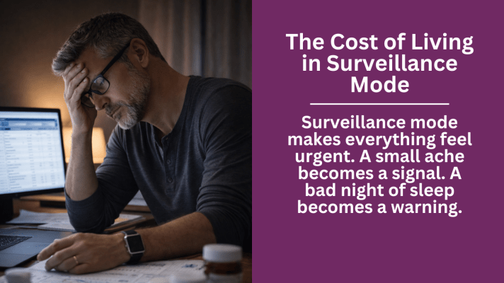 Surveillance mode makes everything feel urgent. A small ache becomes a signal. A bad night of sleep becomes a warning. A minor lab shift becomes a narrative about decline. The nervous system never fully rests. And when your nervous system never rests, neither do you.